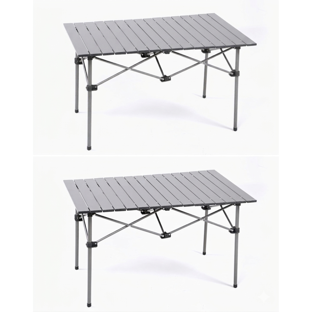Thiết kế gấp gọn và vững chãi Mặt bàn được thiết kế dạng các thanh nhôm liên kết linh hoạt, dễ dàng cuộn lại như một tấm thảm. Hệ thống chân bàn chữ X gia cố giúp phân bổ lực đều, đảm bảo bàn luôn đứng vững trên các bề mặt không bằng phẳng như cỏ, cát hay sỏi đá.