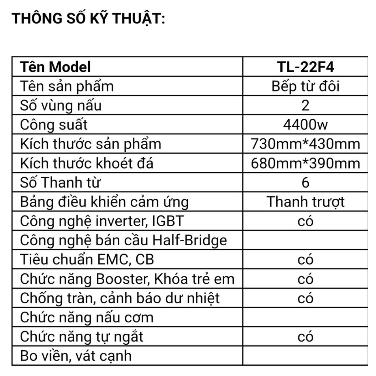 Bếp từ đôi cảm ứng Model: TL-22F4 là sự kết hợp hoàn hảo giữa công nghệ nấu nướng hiện đại và thiết kế tinh tế. Với công suất mạnh mẽ lên đến 4400W cùng công nghệ Inverter thông minh, sản phẩm không chỉ giúp bạn tiết kiệm thời gian đứng bếp mà còn tối ưu hóa điện năng tiêu thụ. Mặt kính Kanger cao cấp chịu lực, chịu nhiệt tốt, mang lại vẻ sang trọng và bền bỉ cho không gian bếp gia đình.