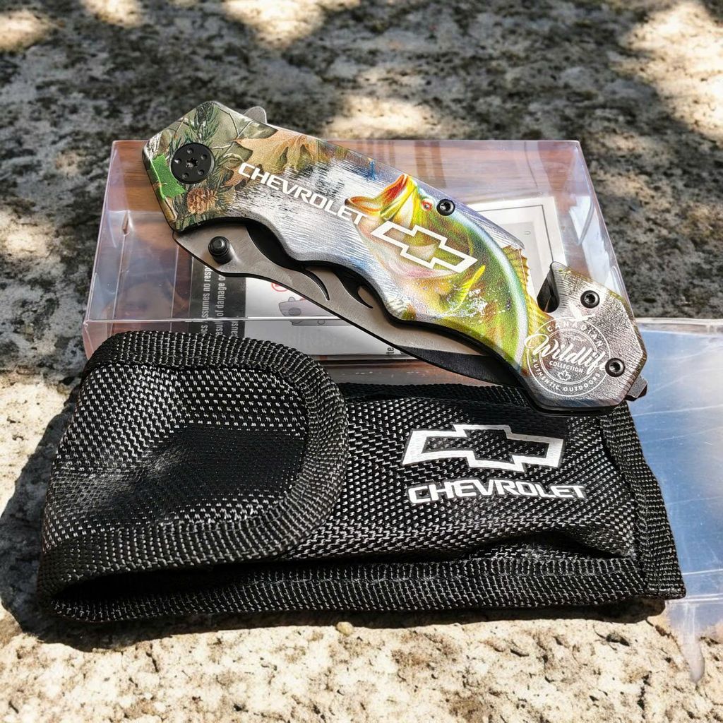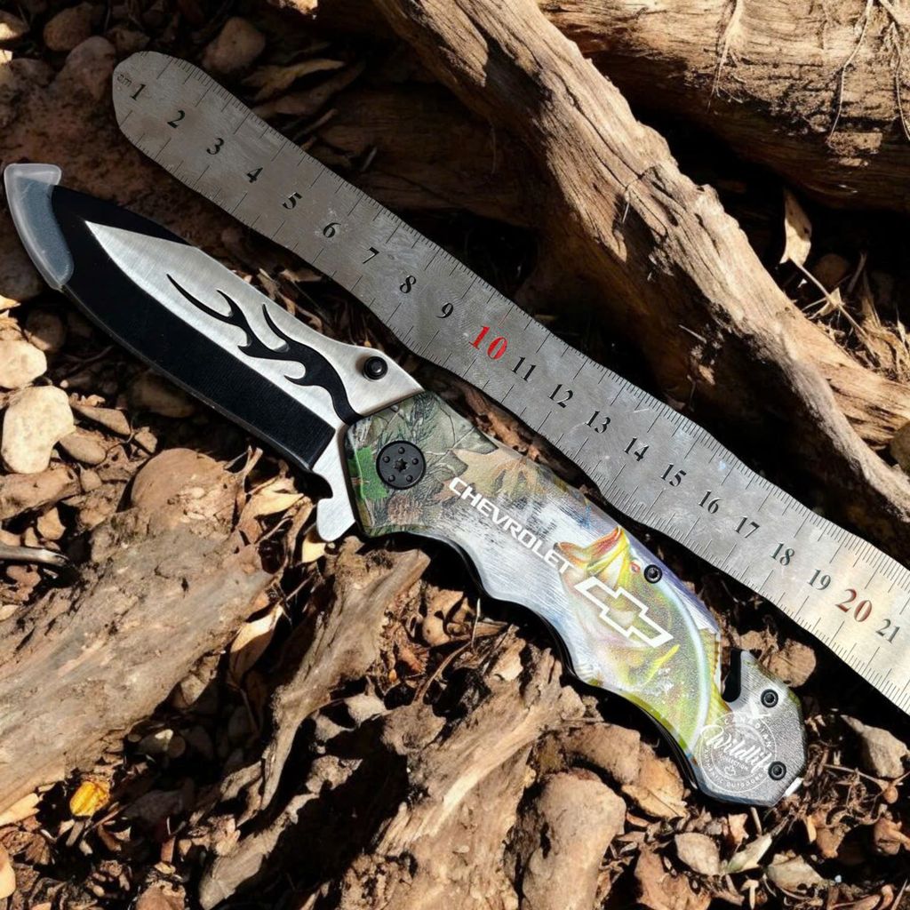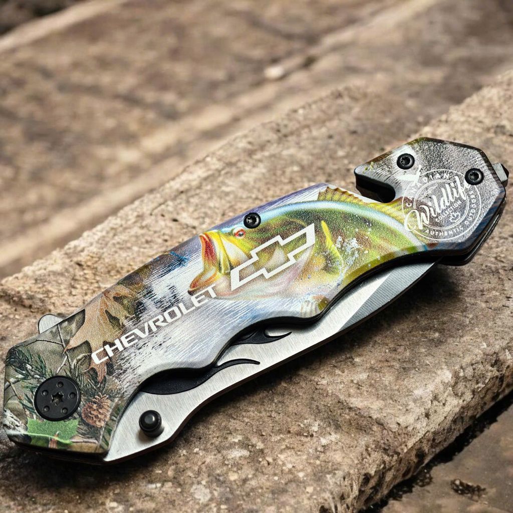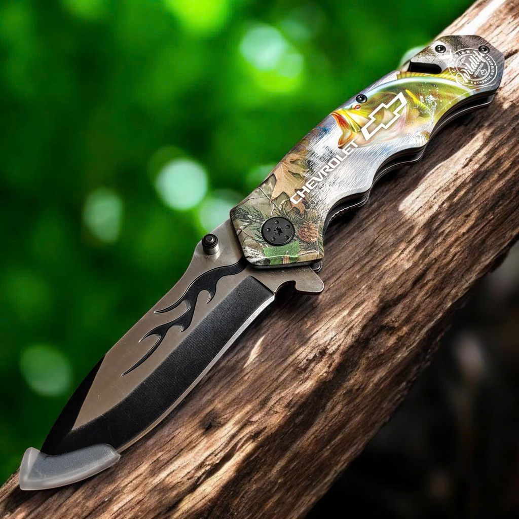 Nằm trong bộ sưu tập Canadian Wildlife của Choko Authentics, mẫu dao này gây ấn tượng mạnh với lớp Graphic 3D sắc nét trên cán dao. Hình ảnh cá Bass nhảy sống động kết hợp cùng họa tiết Camo rừng núi và logo Chevrolet tạo nên một diện mạo đầy uy lực. Điểm nhấn tinh tế nằm ở họa tiết ngọn lửa đen dọc sống dao, mang lại vẻ ngoài "cực ngầu" cho chủ sở hữu.