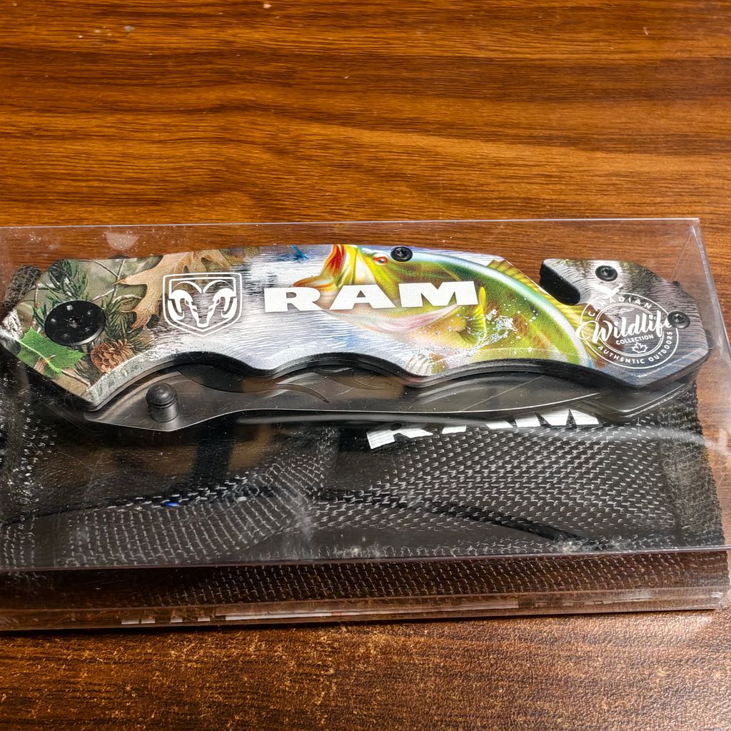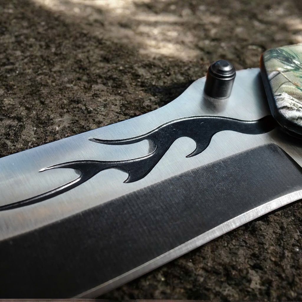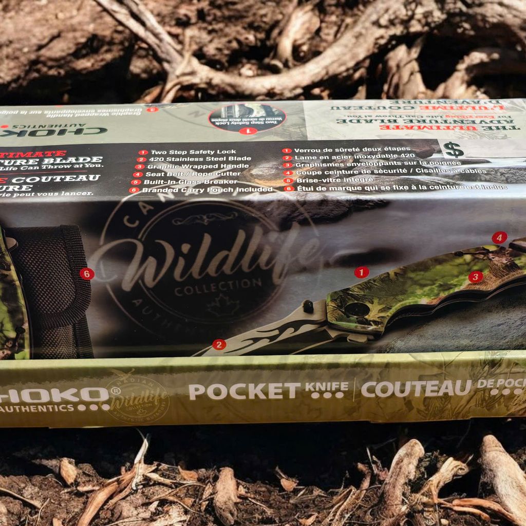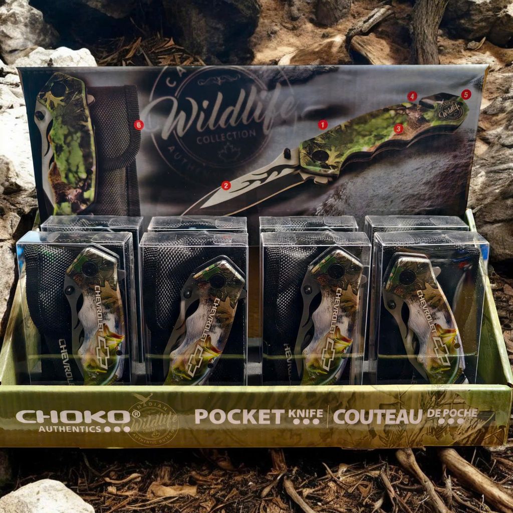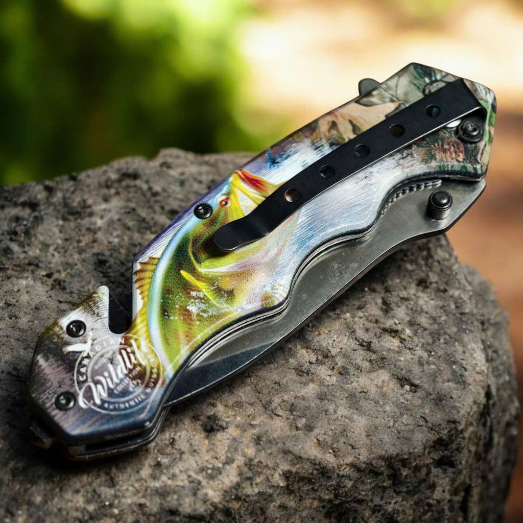 Nằm trong bộ sưu tập Canadian Wildlife của Choko Authentics, mẫu dao này gây ấn tượng mạnh với lớp Graphic 3D sắc nét trên cán dao. Hình ảnh cá Bass nhảy sống động kết hợp cùng họa tiết Camo rừng núi và logo Chevrolet tạo nên một diện mạo đầy uy lực. Điểm nhấn tinh tế nằm ở họa tiết ngọn lửa đen dọc sống dao, mang lại vẻ ngoài "cực ngầu" cho chủ sở hữu.