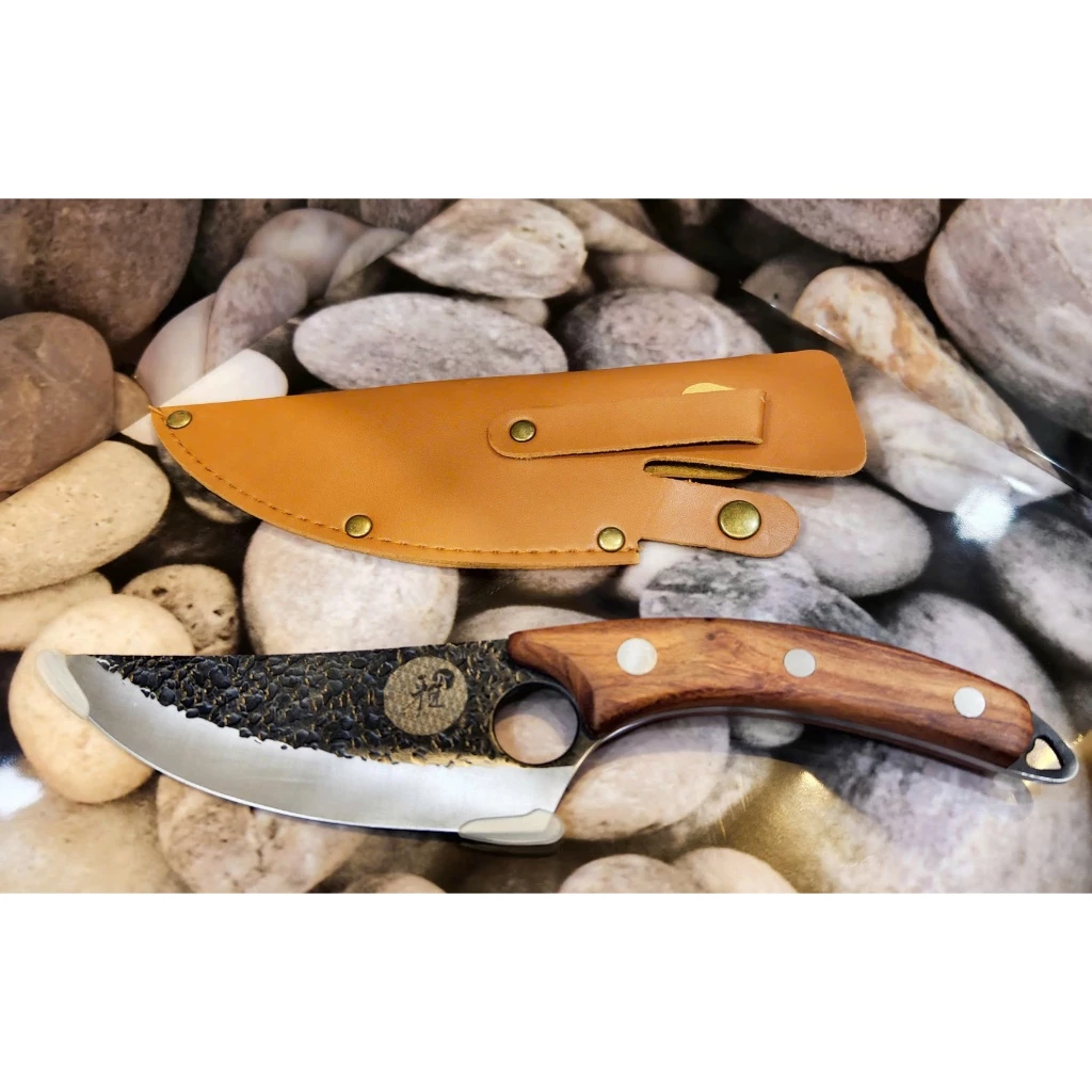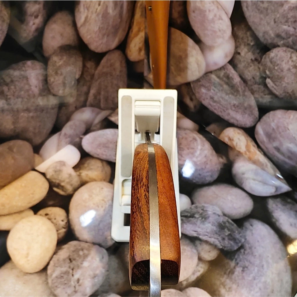 - Tay cầm gỗ tự nhiên đẳng cấp: Cán dao làm từ gỗ cao cấp với vân gỗ rực rỡ, thiết kế công thái học ôm sát lòng bàn tay, chống trơn trượt và mang lại cảm giác cầm nắm chắc chắn.