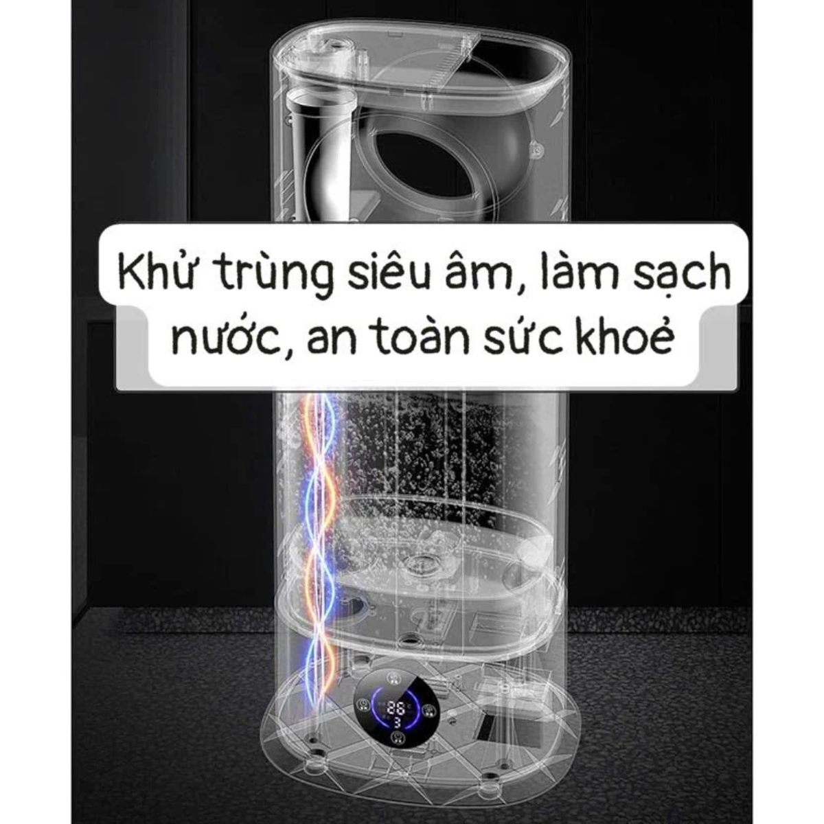 • Công nghệ khử trùng siêu âm tiên tiến: Sử dụng sóng siêu âm tần số cao để phân tách nước thành các hạt sương siêu mịn, đồng thời tiêu diệt vi khuẩn và nấm mốc, đảm bảo luồng hơi ẩm phun ra luôn sạch và tinh khiết.