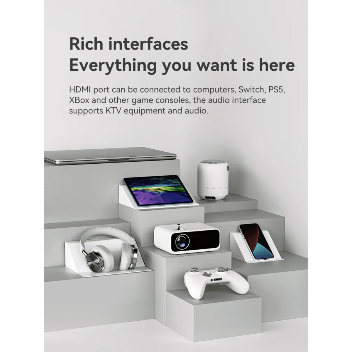 5. Kết nối đa dạng và linh hoạt Wanbo Mini Pro hỗ trợ đầy đủ các cổng kết nối vật lý như HDMI, USB, Jack 3.5mm. Đặc biệt, khả năng kết nối không dây qua Bluetooth và tính năng chia sẻ màn hình điện thoại giúp việc giải trí trở nên không giới hạn.