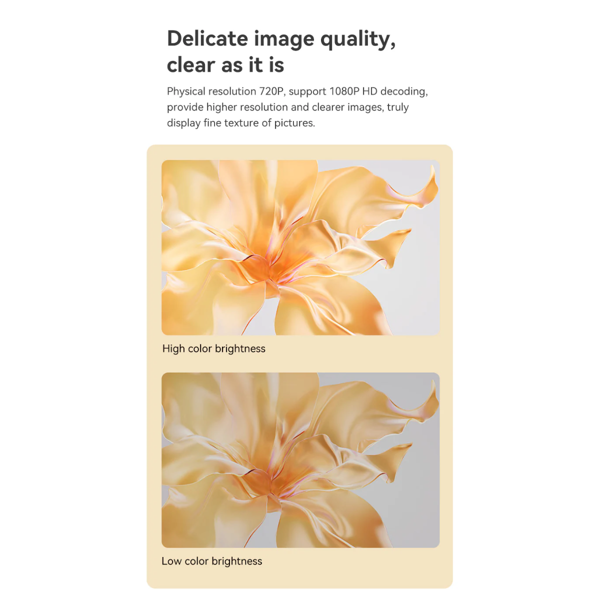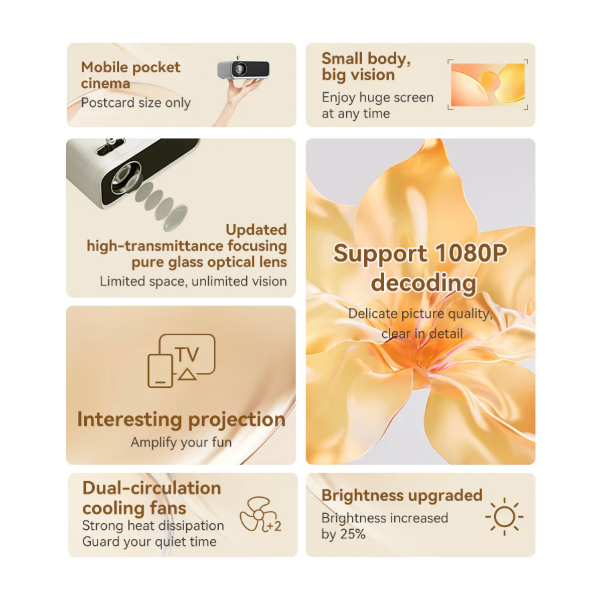 2. Hình ảnh sắc nét và độ sáng cải tiến Được nâng cấp độ sáng hơn 25% so với mẫu cũ, Wanbo Mini Pro cung cấp độ phân giải thực 720P và hỗ trợ giải mã video HD 1080P. Công nghệ thấu kính thủy tinh chất lượng cao giúp hình ảnh hiển thị trong trẻo, chân thực và giảm thiểu tình trạng mờ viền.