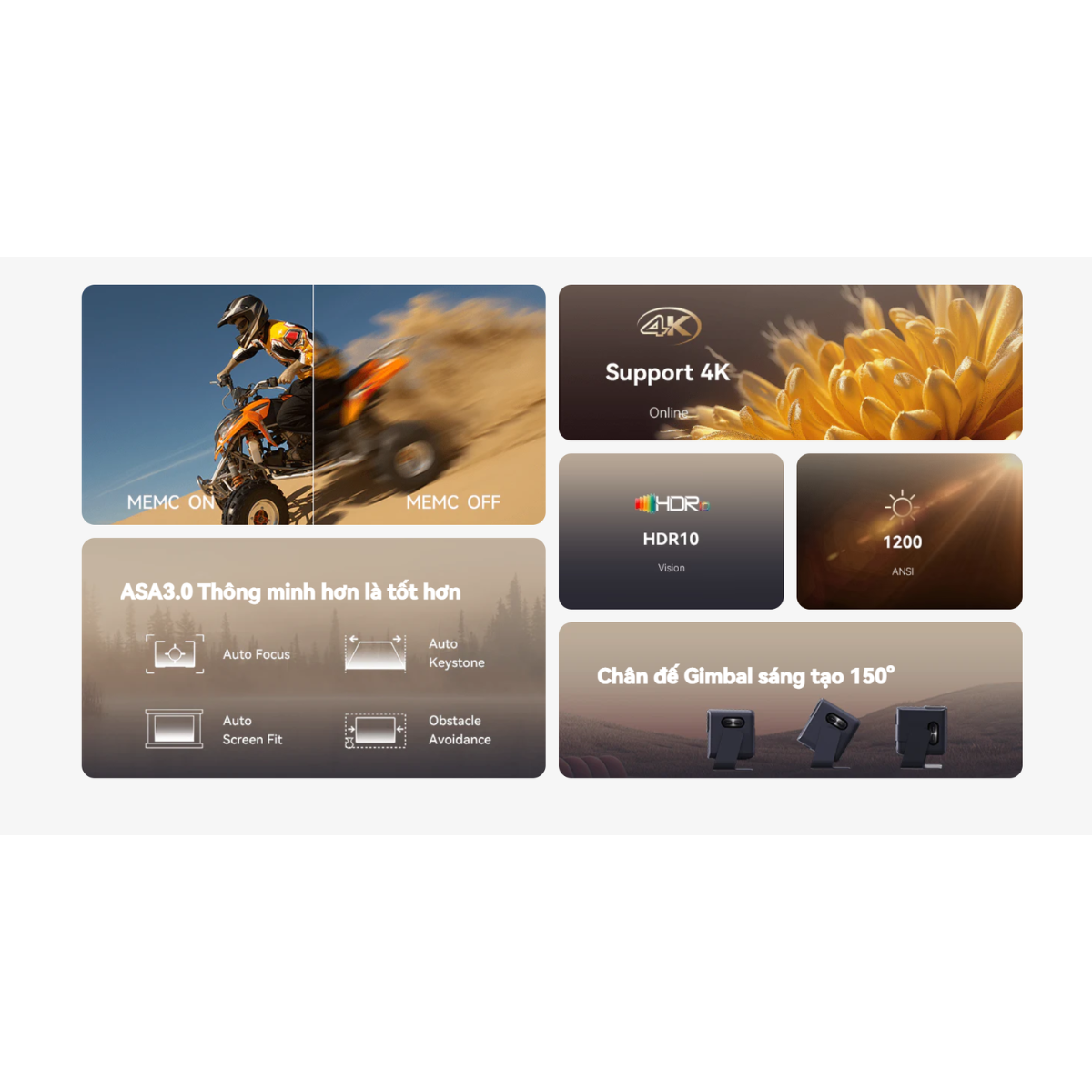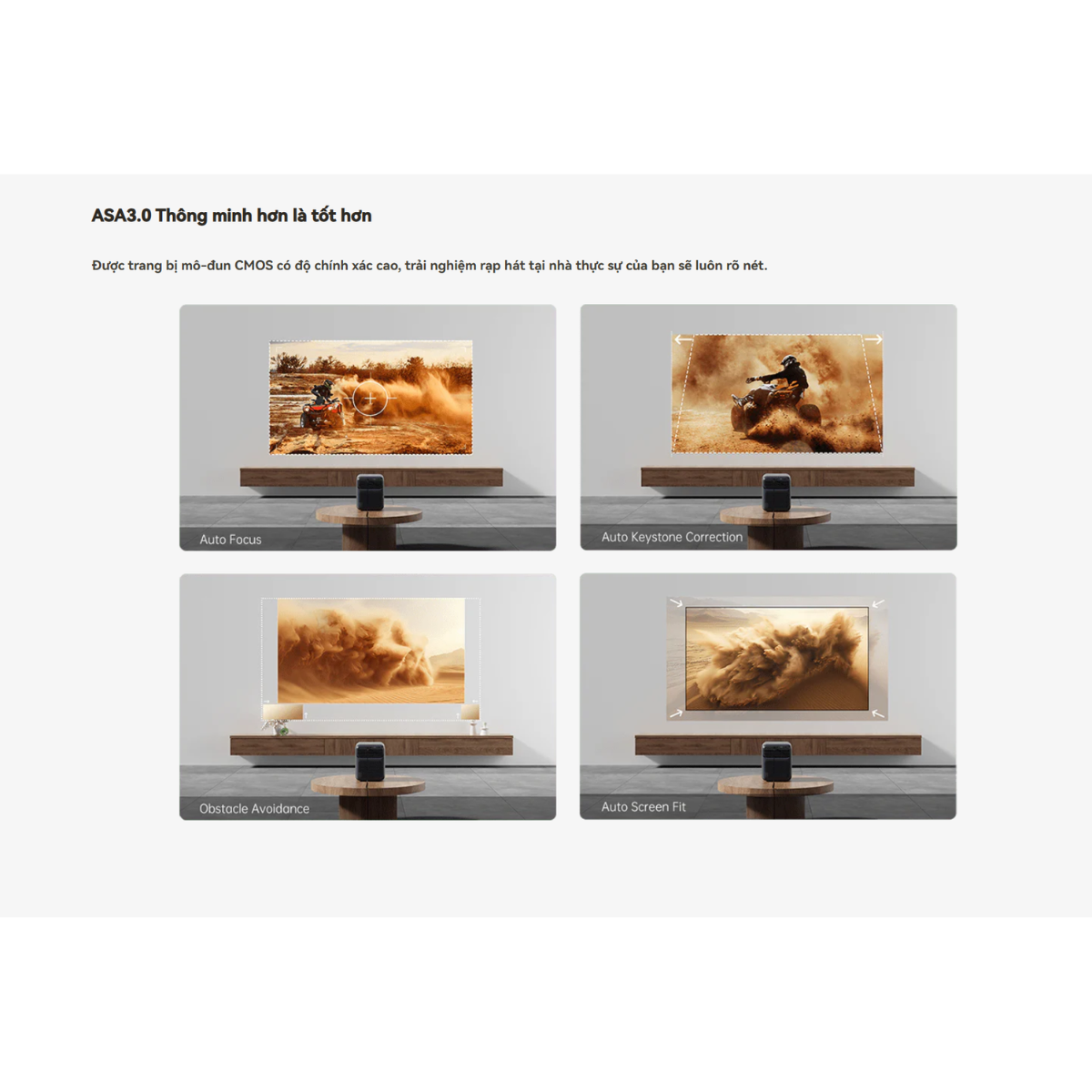• Tránh vật cản & Căn lề màn hình: Tự động nhận diện chướng ngại vật trên tường và tự động khớp hình ảnh vào màn chiếu có sẵn.