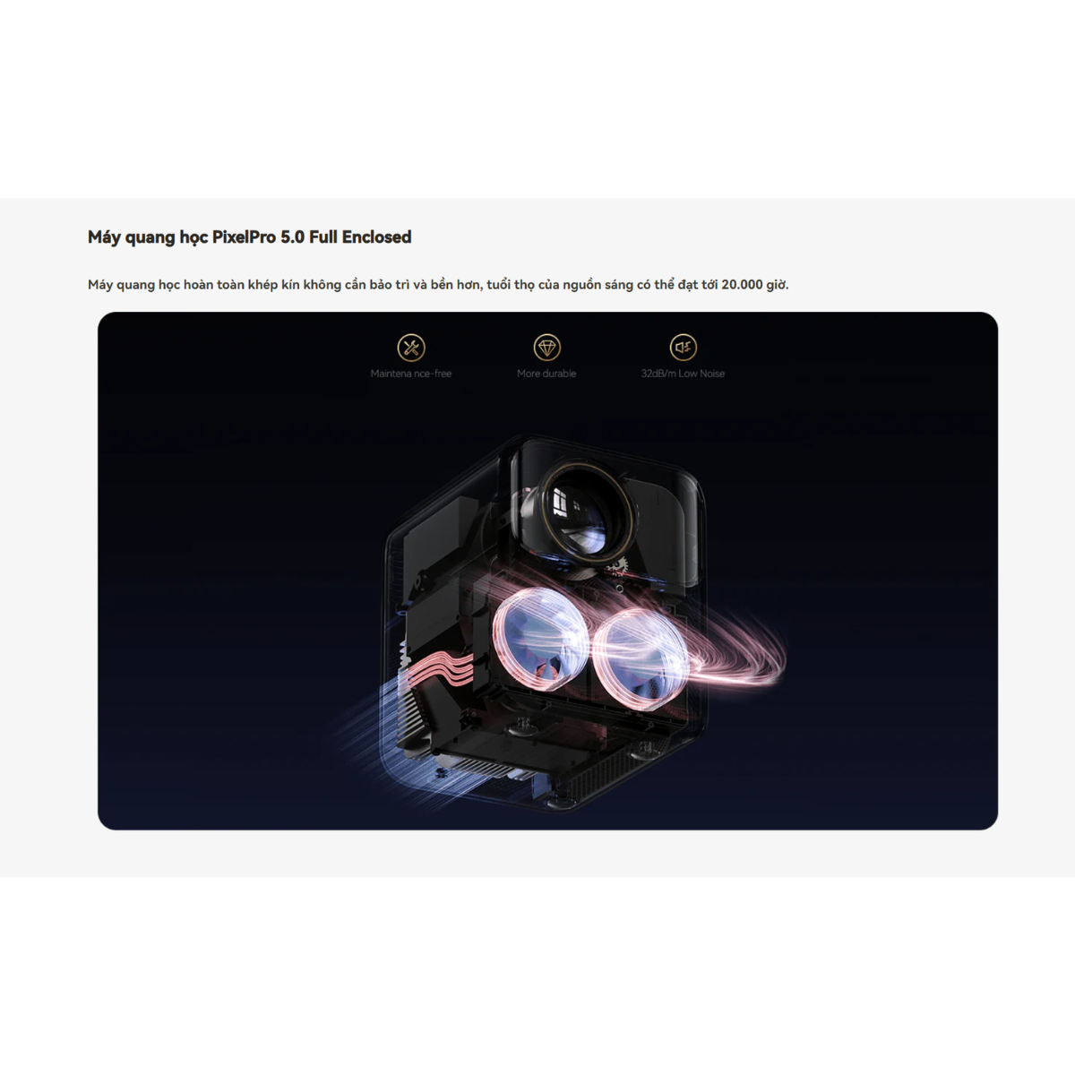 1. Công nghệ quang học PixelPro 5.0 đột phá Mozart 1 Pro sử dụng khối quang học khép kín hoàn toàn thế hệ mới nhất PixelPro 5.0. Công nghệ này không chỉ ngăn ngừa bụi bẩn xâm nhập hiệu quả mà còn giúp tăng cường độ truyền dẫn ánh sáng, mang lại độ phân giải Full HD 1080P sắc nét và khả năng giải mã nội dung 4K cực kỳ mượt mà.