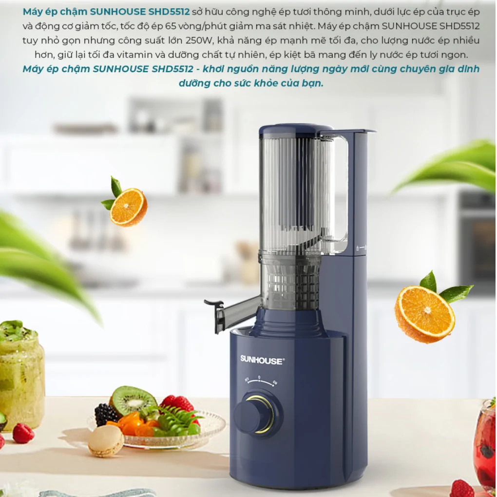 Máy ép chậm Sunhouse SHD5512 sở hữu công suất mạnh mẽ 250W kết hợp công nghệ ép tươi thông minh, giúp ép kiệt bã mọi loại rau củ quả nhiều xơ mà vẫn giữ trọn vẹn vitamin và hương vị tự nhiên. Thiết kế nhỏ gọn, hiện đại với động cơ lõi đồng vận hành êm ái, đây là lựa chọn hoàn hảo cho sức khỏe gia đình bạn.