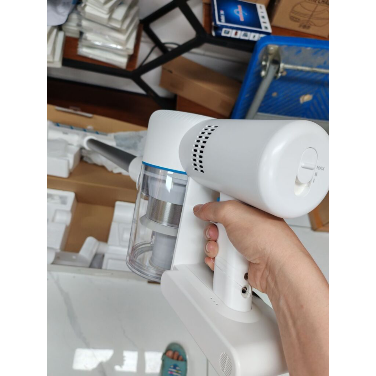 • Thiết kế công thái học nhẹ nhàng: Trọng lượng máy được phân bổ hợp lý giúp bạn dễ dàng nhấc máy để vệ sinh rèm cửa, trần nhà hoặc dọn dẹp bằng một tay mà không bị mỏi.