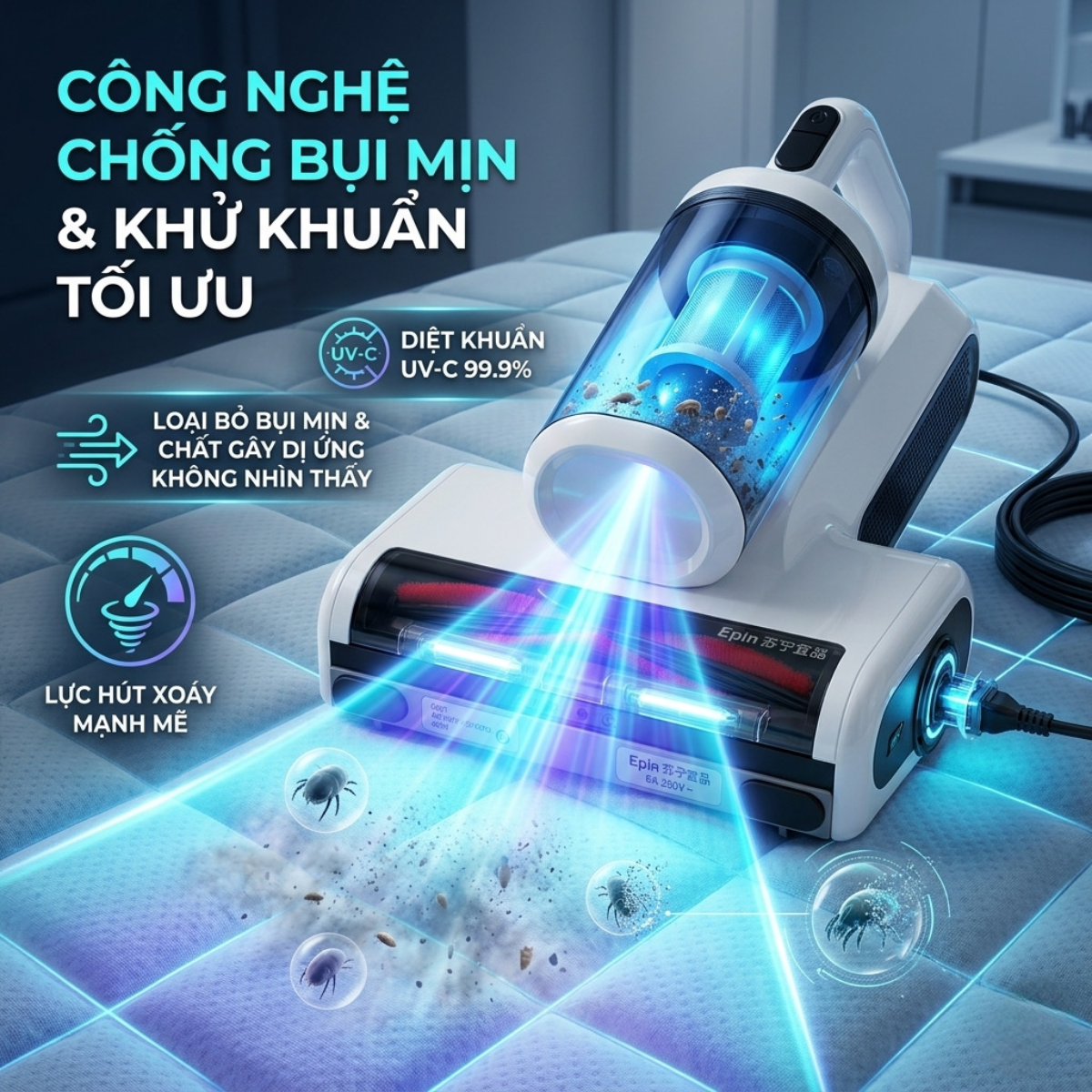 Công nghệ diệt khuẩn bằng tia UV và nhiệt độ Để đảm bảo môi trường sống hoàn toàn sạch khuẩn, EPIN C001 tích hợp hệ thống đèn UV diệt khuẩn năng lượng cao. Tia UV xuyên qua các lớp đệm để phá hủy cấu trúc DNA của vi khuẩn và bọ mạt. Đồng thời, hơi nhiệt tỏa ra trong quá trình hoạt động giúp làm khô nệm, ngăn ngừa nấm mốc phát triển.