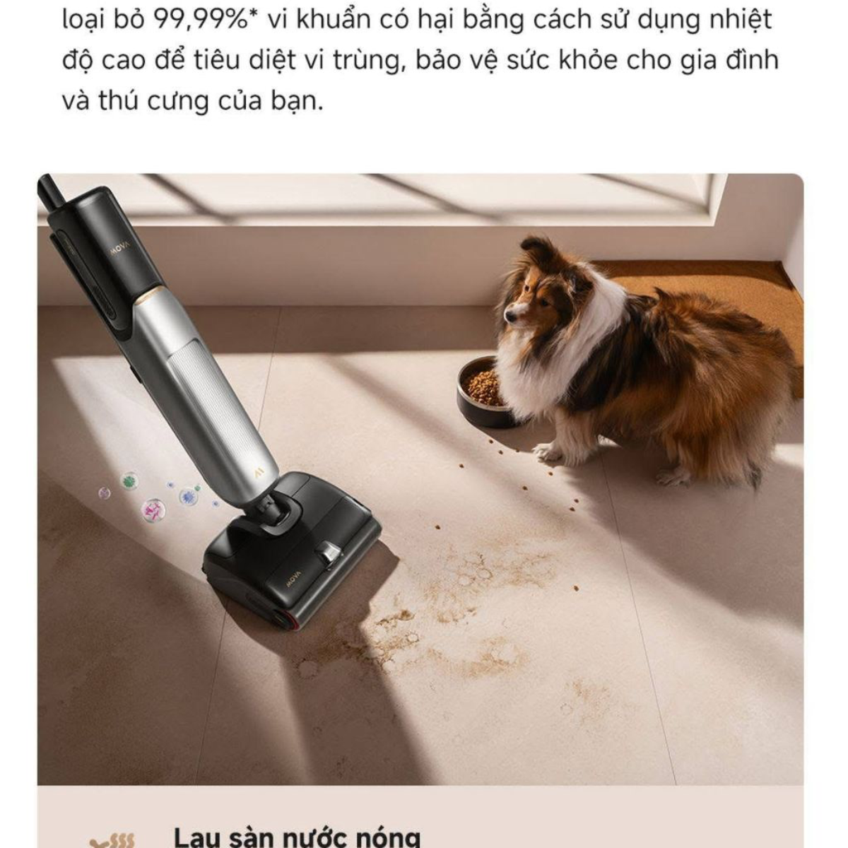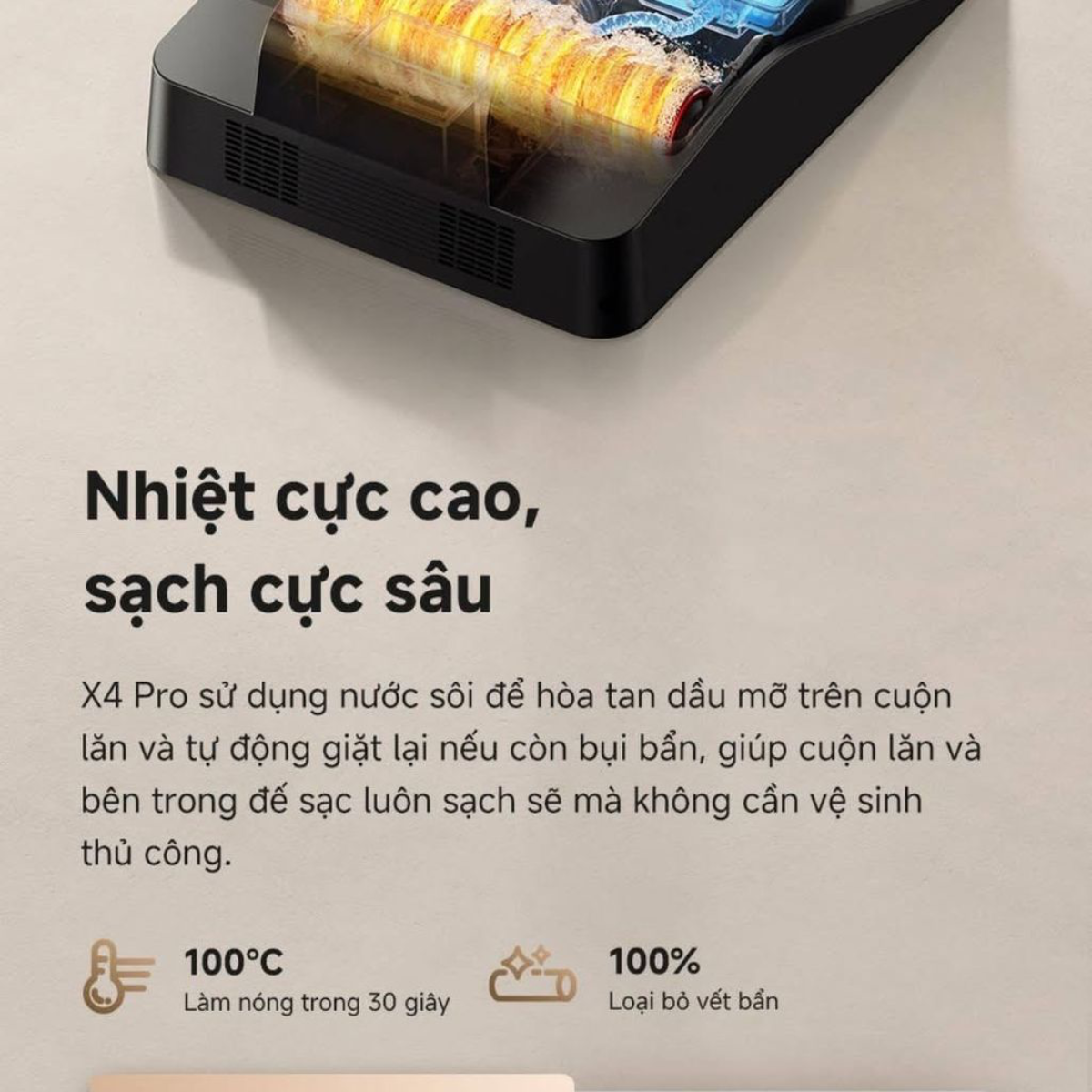 Công nghệ giặt giẻ nước nóng 90°C đột phá Khác biệt hoàn toàn với các dòng máy thông thường, Mova X40 Plus trang bị hệ thống đun nước nóng tức thì lên đến 90°C. Nước nóng giúp hòa tan dầu mỡ, làm mềm các vết bẩn khô cứng và tăng hiệu quả diệt khuẩn lên đến 99.9%, đảm bảo cây lau luôn sạch sẽ sau mỗi lần sử dụng.