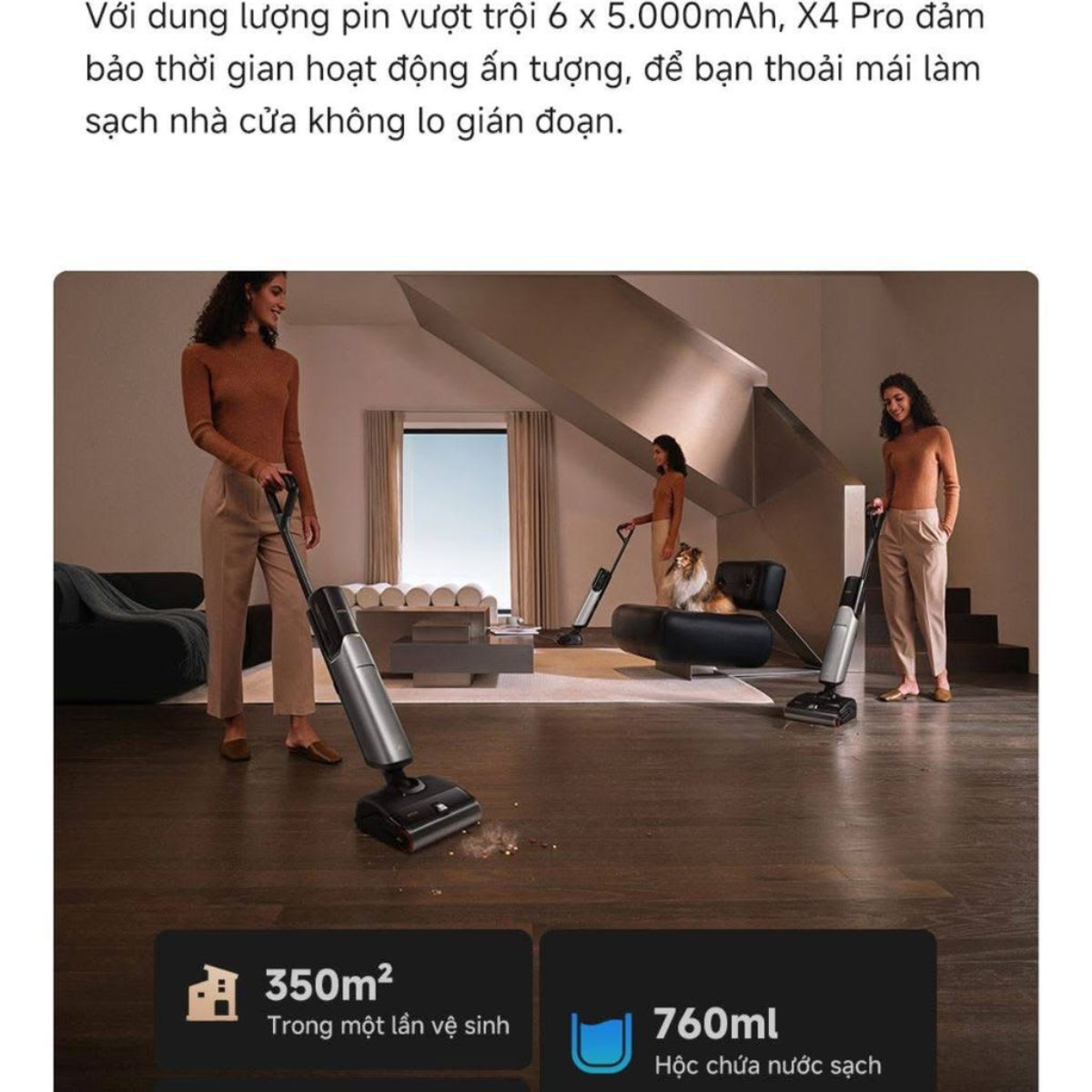 Dung lượng pin lớn và Bình chứa nước kép Với viên pin dung lượng cao, máy có thể hoạt động liên tục trong thời gian dài, đủ để làm sạch diện tích mặt sàn lên đến 200m². Hệ thống bình chứa nước sạch và nước thải dung tích lớn giúp bạn dọn dẹp xuyên suốt mà không cần thay nước nhiều lần.