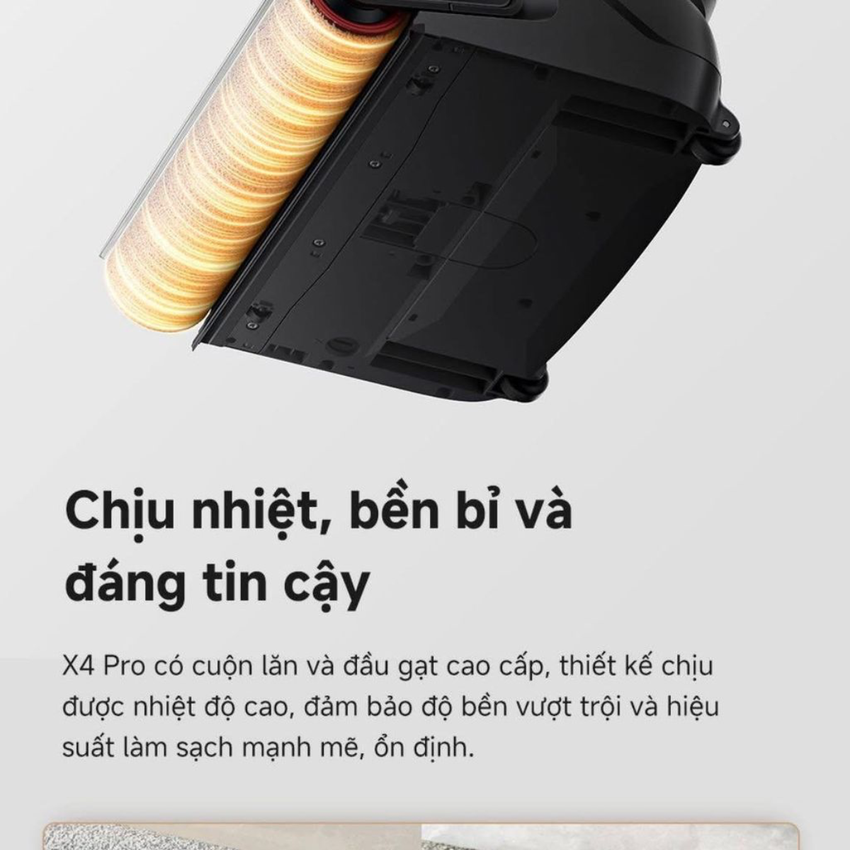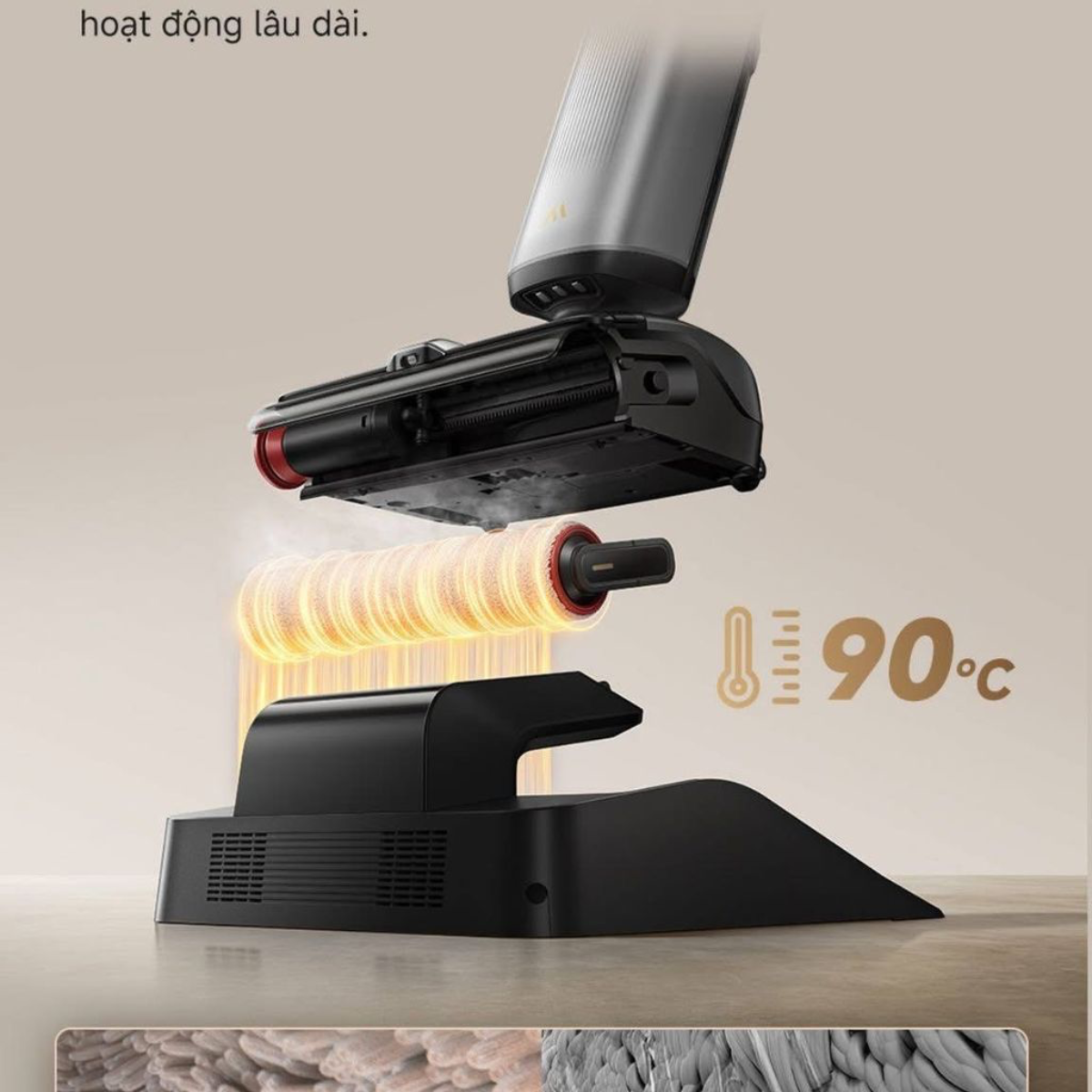 Tự động sấy khô giẻ lau bằng khí nóng Sau khi hoàn tất chu trình tự làm sạch bằng nước nóng, dock sạc sẽ kích hoạt chế độ sấy khô giẻ bằng luồng khí nóng tuần hoàn. Quá trình này giúp giẻ lau khô ráo hoàn toàn, ngăn ngừa sự phát triển của nấm mốc và loại bỏ mùi ẩm mốc khó chịu thường gặp trên các loại máy lau sàn truyền thống.