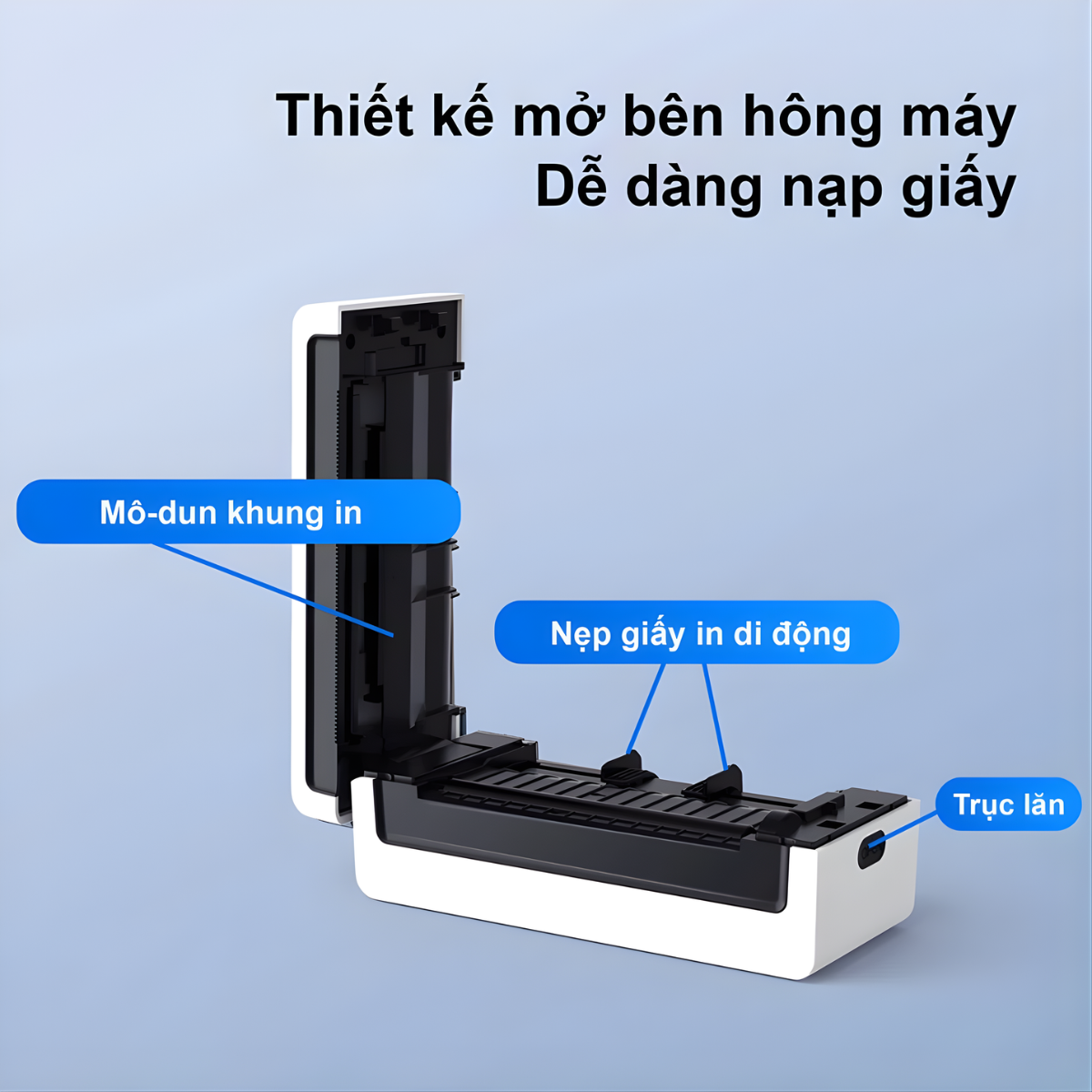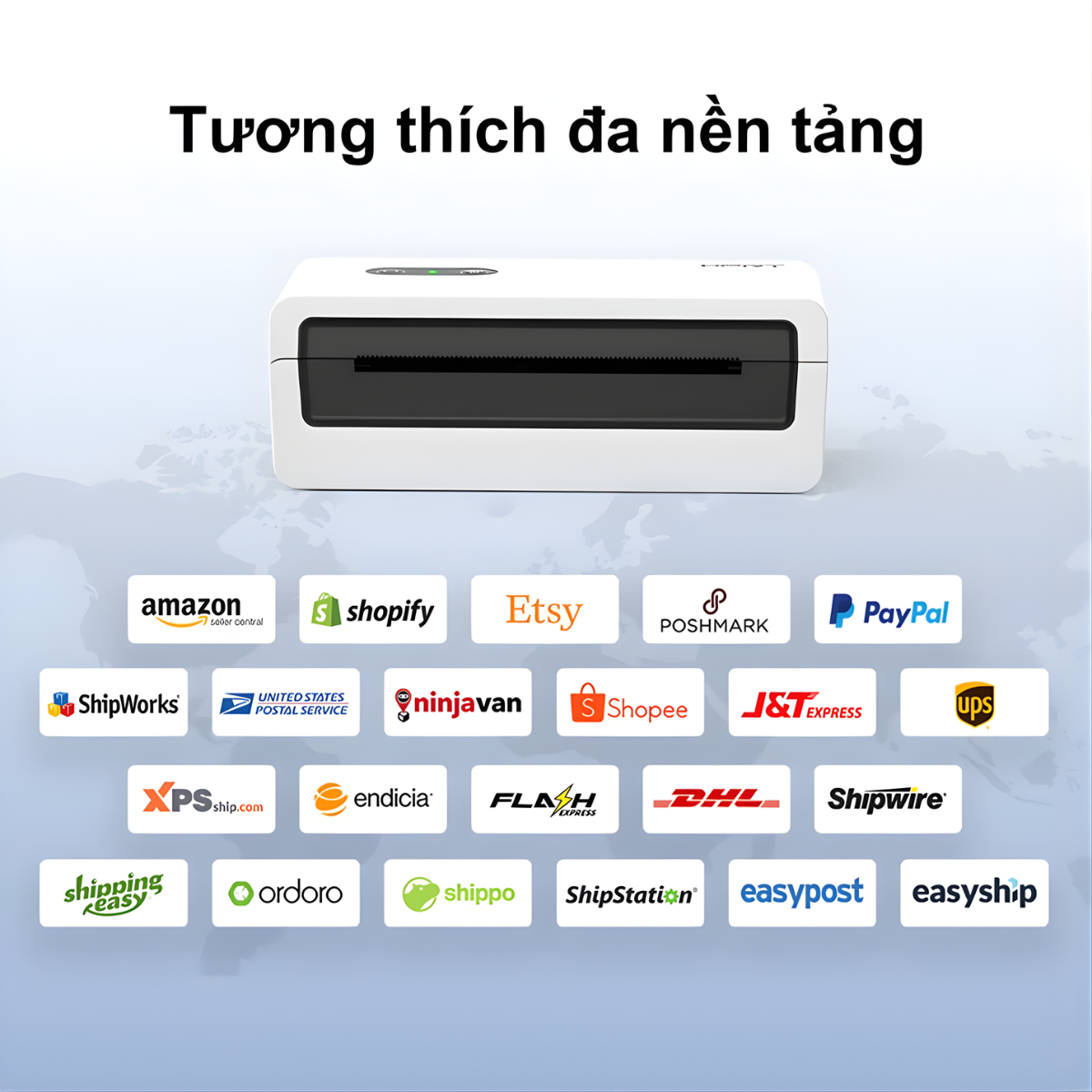 Máy hỗ trợ khổ giấy in rộng lên đến 108mm, phù hợp hoàn hảo cho các loại tem vận chuyển phổ biến như A6 (100x150mm), tem mã vạch, tem trà sữa hay nhãn phân loại kho hàng. N43BT tương thích tốt với các nền tảng bán hàng hàng đầu hiện nay như Shopee, Lazada, TikTok Shop và các đơn vị vận chuyển (GHTK, GHN, Viettel Post...).