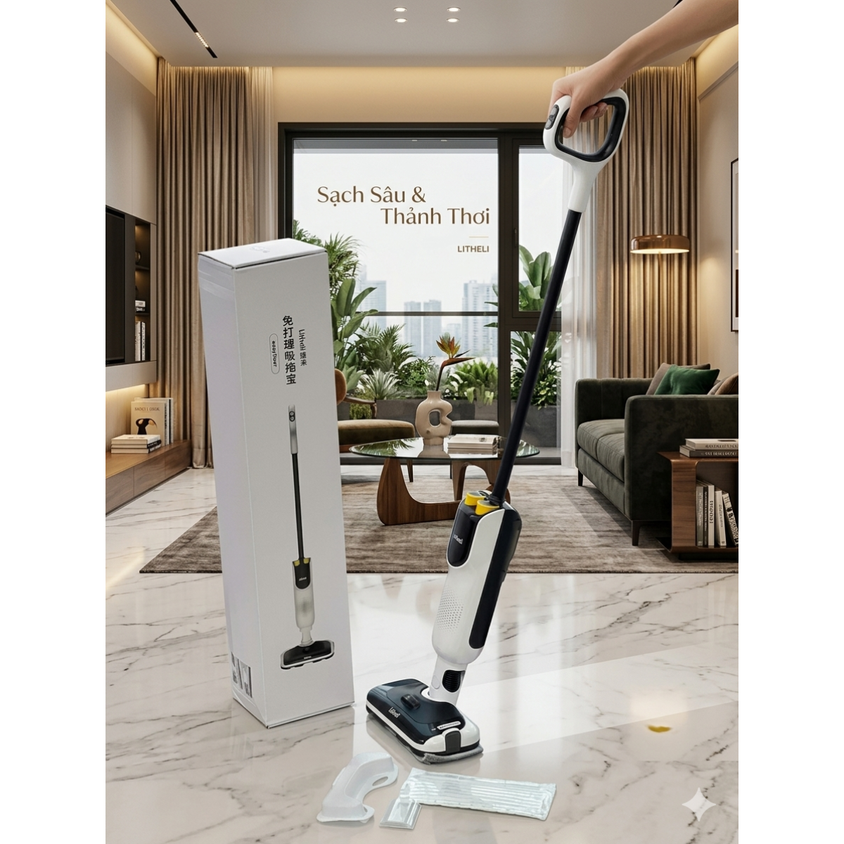 Máy lau nhà và hút bụi 2 trong 1 Litheli là giải pháp dọn dẹp hiện đại, kết hợp khả năng hút bụi mạnh mẽ và lau sàn liên tục. Với thiết kế không dây linh hoạt, hệ thống tự làm sạch chổi lăn và công nghệ tách biệt nước sạch - nước bẩn, Litheli giúp bạn tiết kiệm 50% thời gian dọn dẹp mà vẫn đảm bảo mặt sàn sạch bóng, khô ráo tức thì.
