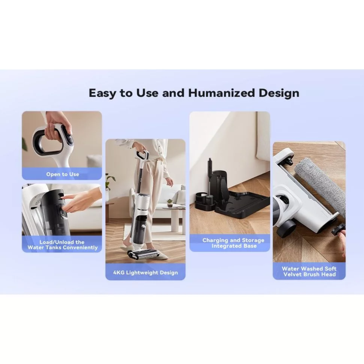 Tính năng tự làm sạch (Self-Cleaning) thông minh Sau khi hoàn tất công việc dọn dẹp, bạn chỉ cần đặt máy vào dock sạc và nhấn nút. Hệ thống sẽ tự động giặt sạch chổi lăn bằng nước sạch, loại bỏ hoàn toàn bụi bẩn và chất bẩn bám trên giẻ. Bạn sẽ không còn phải giặt giẻ bằng tay, giúp tiết kiệm thời gian và giữ cho đôi tay luôn sạch sẽ.