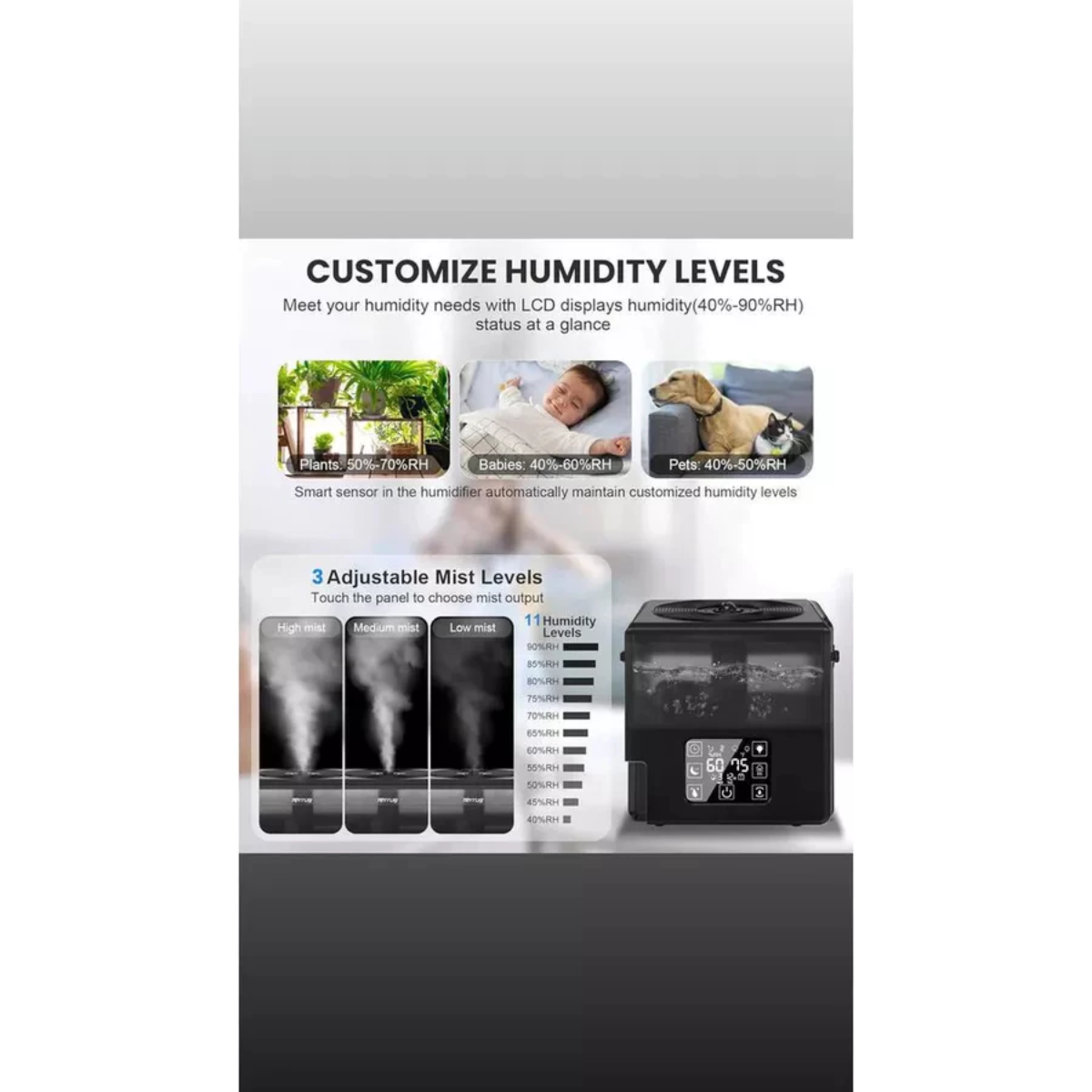 Thiết bị cho phép cài đặt độ ẩm mong muốn (từ 40% - 90%). Khi đạt đến ngưỡng thiết lập, máy sẽ tự động ngắt để tránh tình trạng quá ẩm gây nấm mốc. Đặc biệt, chế độ tự ngắt khi hết nước giúp đảm bảo an toàn tuyệt đối và kéo dài tuổi thọ cho động cơ.
