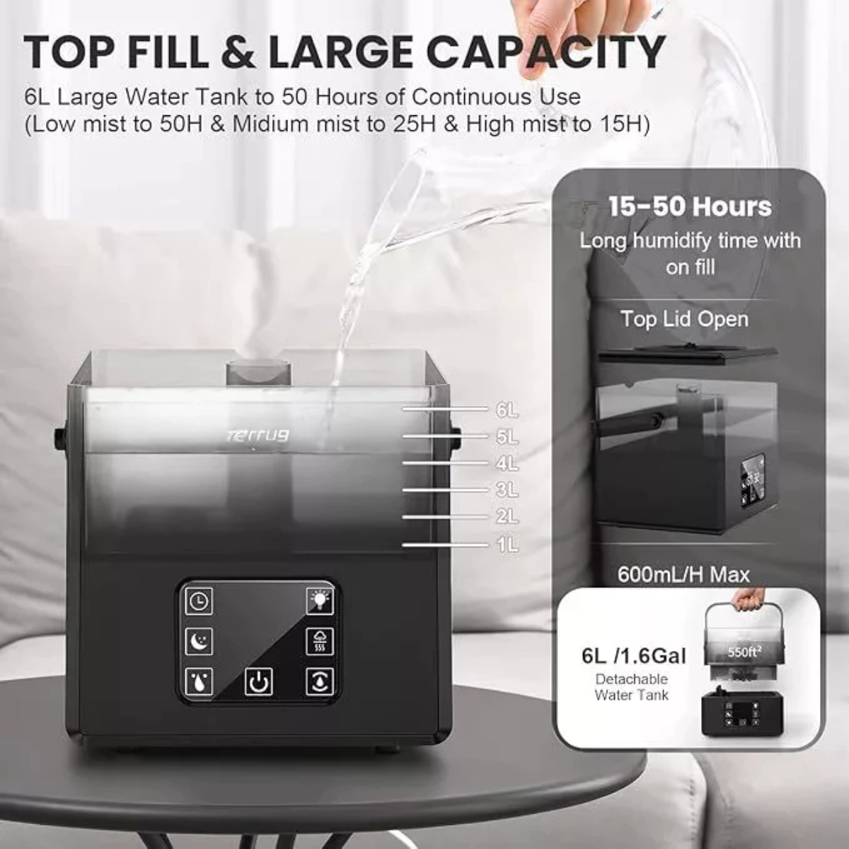 Với bình chứa nước dung tích lên đến 6L, IonZen Gen 2 có thể hoạt động liên tục tối đa 50 giờ chỉ với một lần châm nước. Công suất phun sương đạt 600ml/h, dễ dàng phủ ẩm đều cho các không gian lớn như phòng khách, văn phòng làm việc hay các spa diện tích rộng.