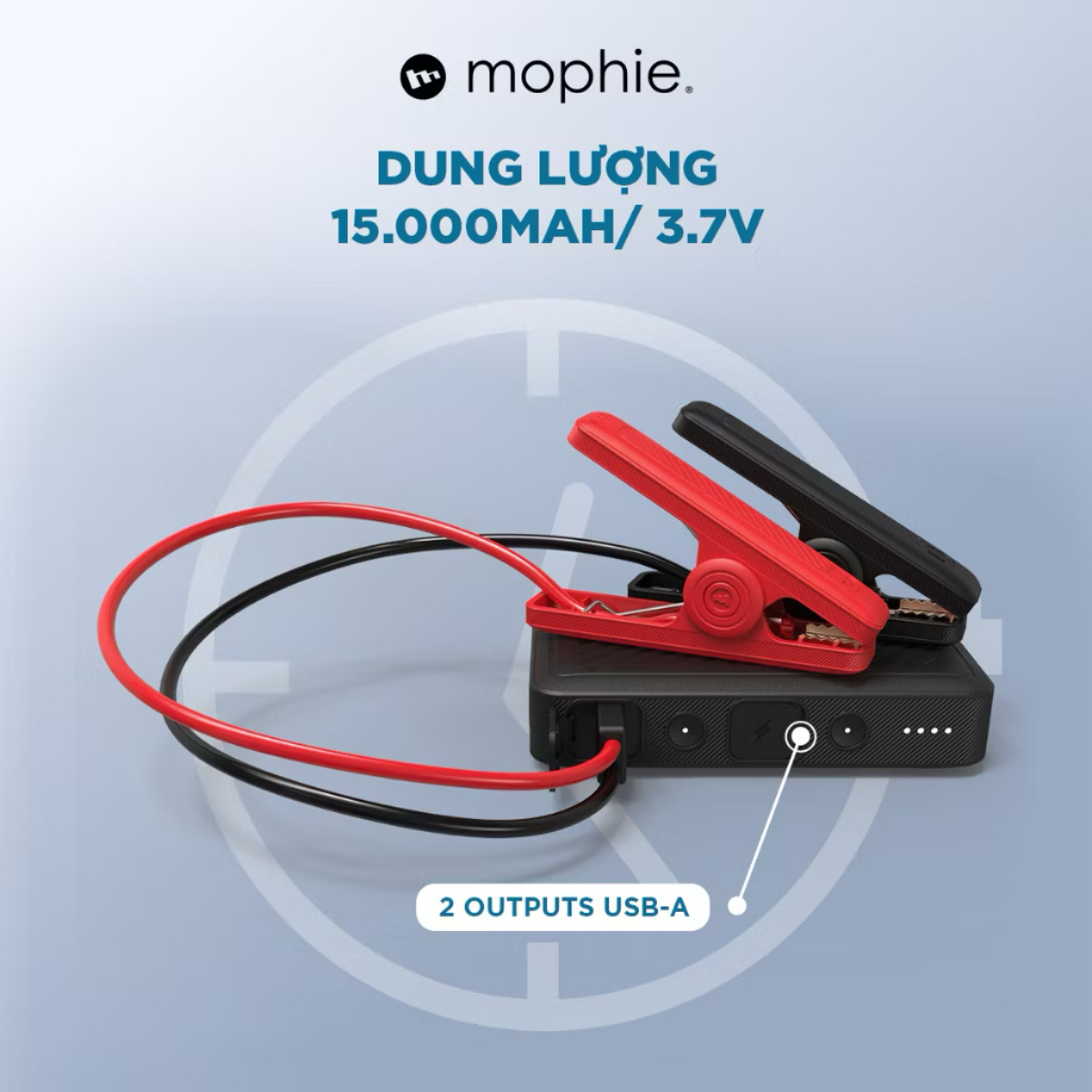 2. Khả năng kích bình mạnh mẽ và an toàn Sở hữu dòng điện khởi động lớn, Mophie AC55500 dễ dàng kích nổ các dòng xe xăng và xe máy phổ biến. Bộ dây cáp kích bình thông minh đi kèm có các tính năng bảo vệ chống ngược cực, chống quá tải và chống đoản mạch, giúp người dùng hoàn toàn yên tâm thao tác ngay cả khi không có chuyên môn kỹ thuật.