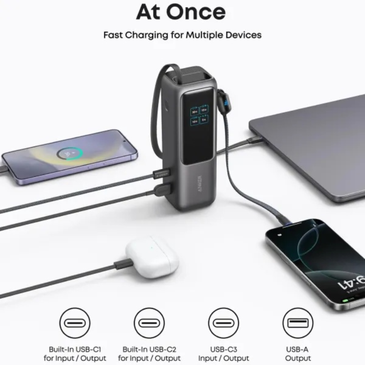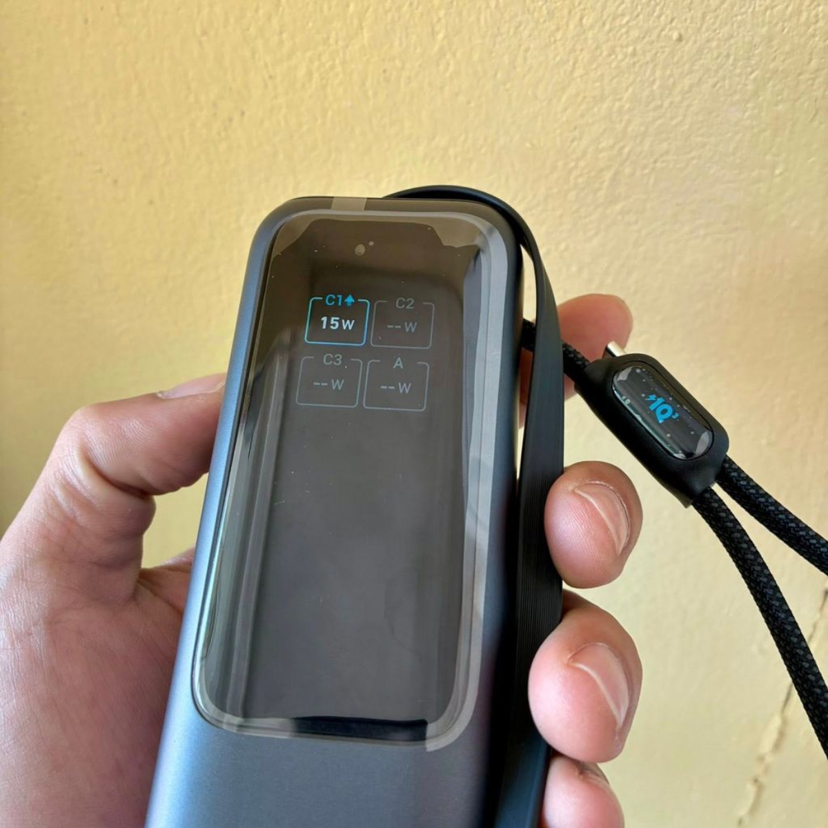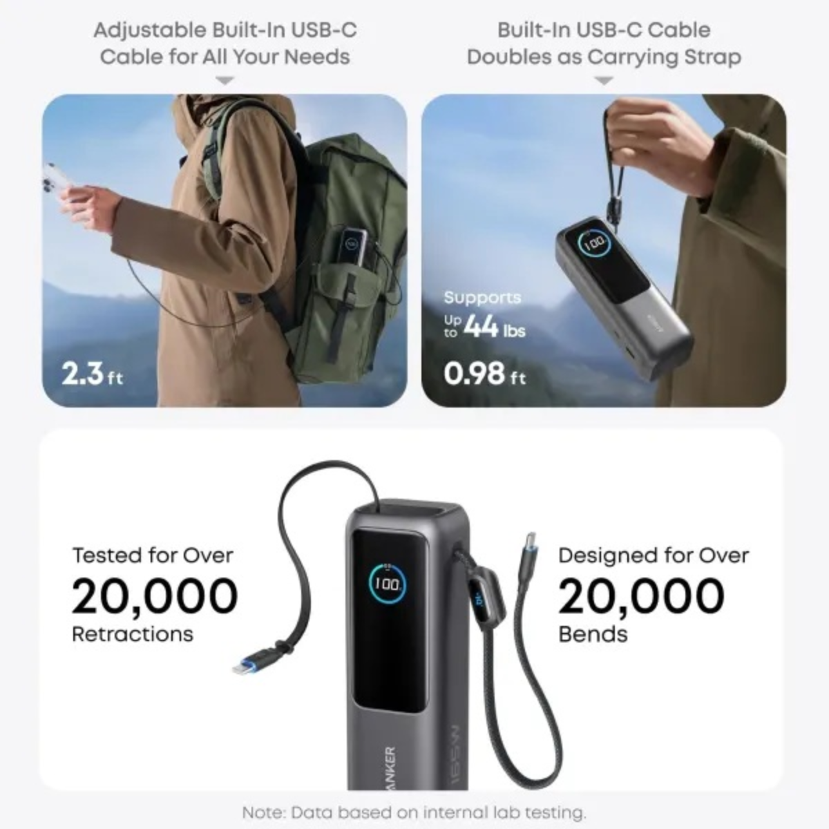 Điểm đột phá của Anker A1695 chính là việc tích hợp sẵn 2 dây cáp sạc Type-C ngay trên thân pin. Bạn sẽ không bao giờ phải lo lắng về việc quên mang dây cáp khi ra ngoài. Dây cáp được hoàn thiện chắc chắn, chịu được hàng ngàn lần gập mở, giúp không gian làm việc và túi xách của bạn luôn gọn gàng.