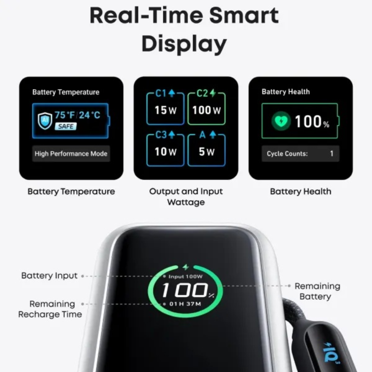 Sản phẩm trang bị màn hình màu cao cấp, hiển thị chi tiết trạng thái hoạt động của pin bao gồm: phần trăm pin còn lại, công suất sạc vào/ra (W) cho từng cổng và thời gian sạc đầy dự kiến. Đây là tính năng cực kỳ hữu ích giúp người dùng chuyên nghiệp quản lý năng lượng một cách khoa học.