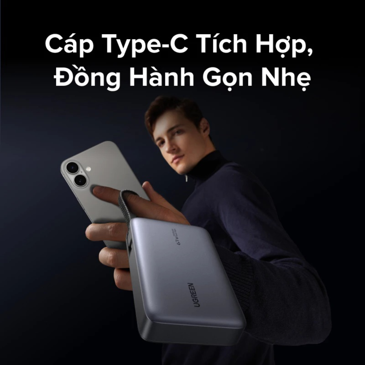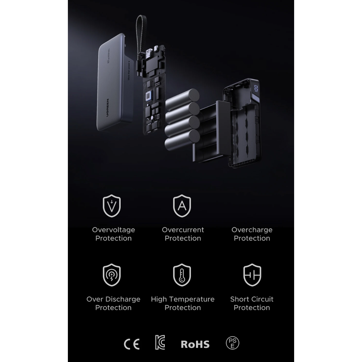 UGREEN PB550 đạt chứng nhận CCC (China Compulsory Certificate), đảm bảo các tiêu chuẩn khắt khe về chống cháy nổ và an toàn điện. Thiết kế nhỏ gọn với bề mặt hoàn thiện tinh xảo, chống bám vân tay, giúp bạn dễ dàng mang theo trong túi xách hoặc balo mà không chiếm quá nhiều diện tích.