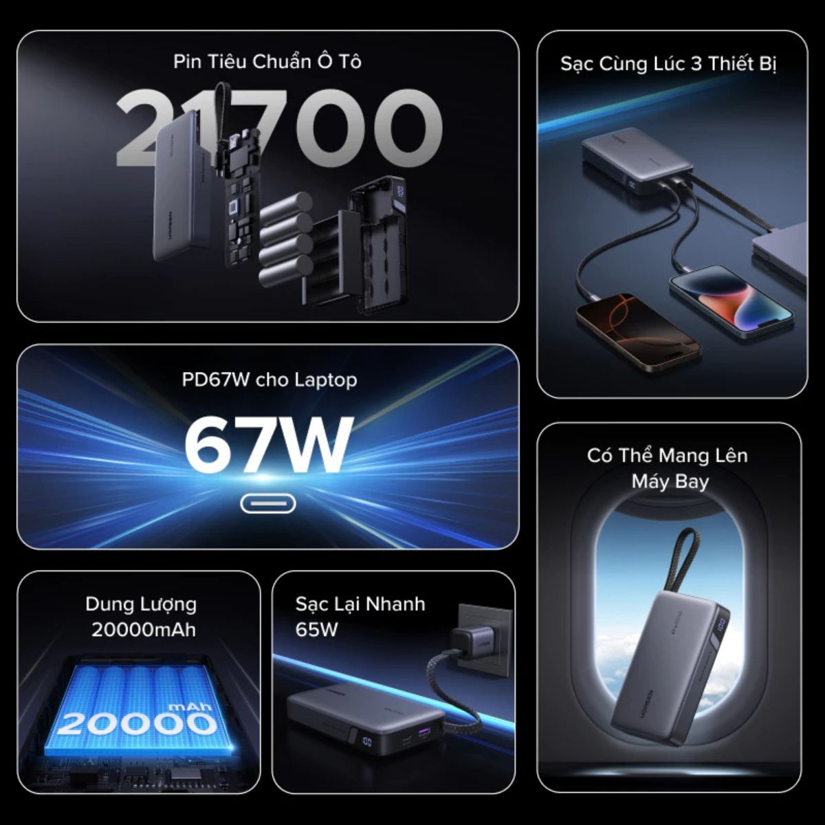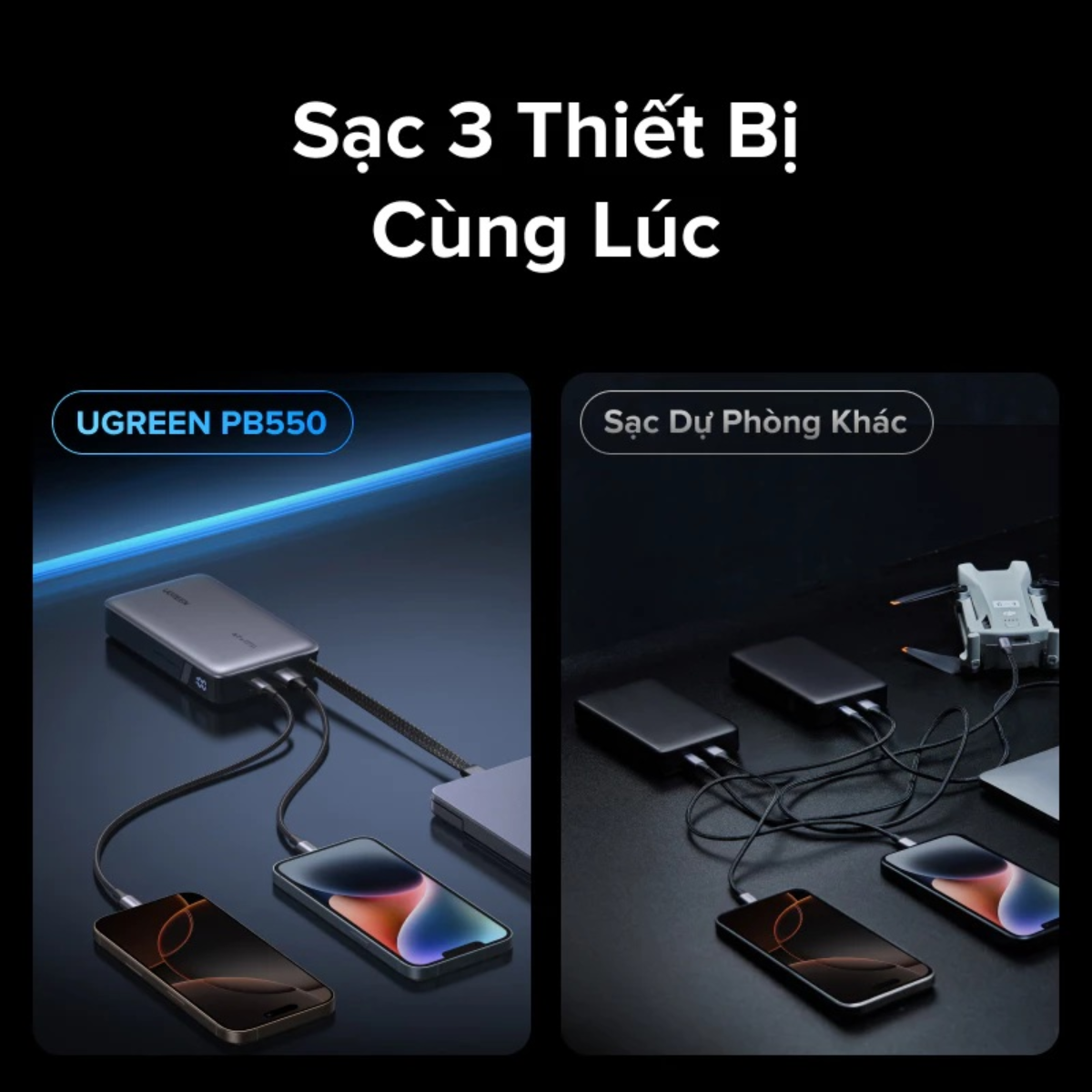 Pin sạc dự phòng UGREEN PB550 67W 20000mAh là dòng pin dự phòng cao cấp thế hệ mới, được trang bị công suất mạnh mẽ lên đến 67W. Sản phẩm đặc biệt tối ưu cho người dùng Xiaomi với chuẩn PPS 5A và giao thức UFCS, giúp sạc nhanh vượt trội cho cả Laptop, MacBook và các dòng smartphone Android hiện đại nhất.