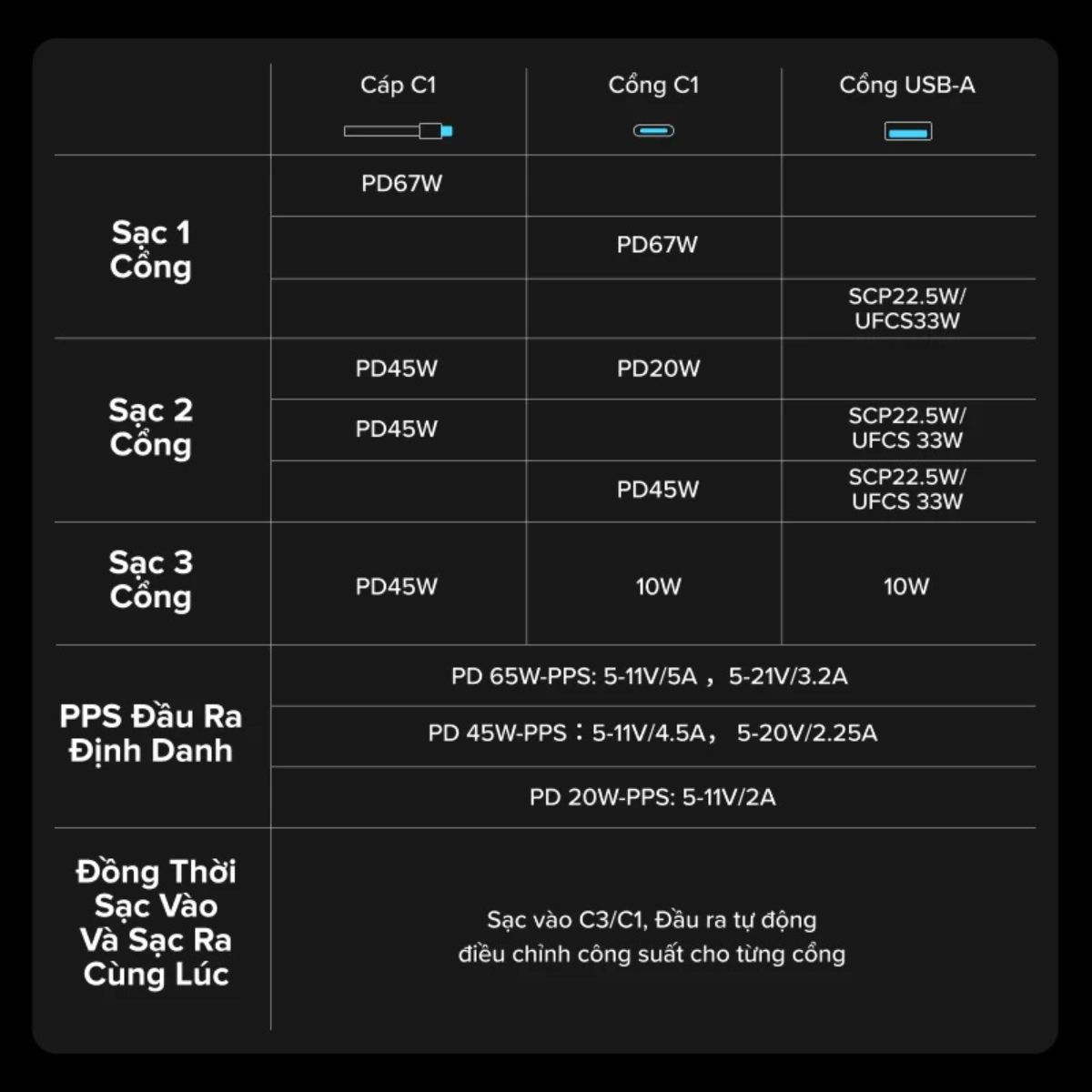 • Đầu ra (Output): * USB-C: 67W Max (hỗ trợ PD 3.0, PPS 5A, UFCS)