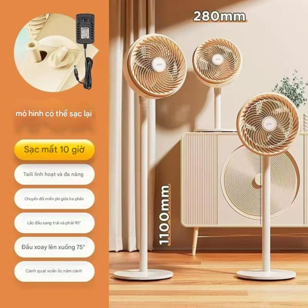 Sản phẩm sở hữu khả năng điều chỉnh linh hoạt với góc lắc ngang lên đến 90° và đầu xoay lên xuống 75°. Điều này giúp luồng không khí được lưu thông đều khắp phòng, từ phòng khách rộng lớn đến phòng ngủ ấm cúng. Chiều cao thân quạt lên tới 1100mm, phù hợp với nhiều vị trí sử dụng khác nhau.