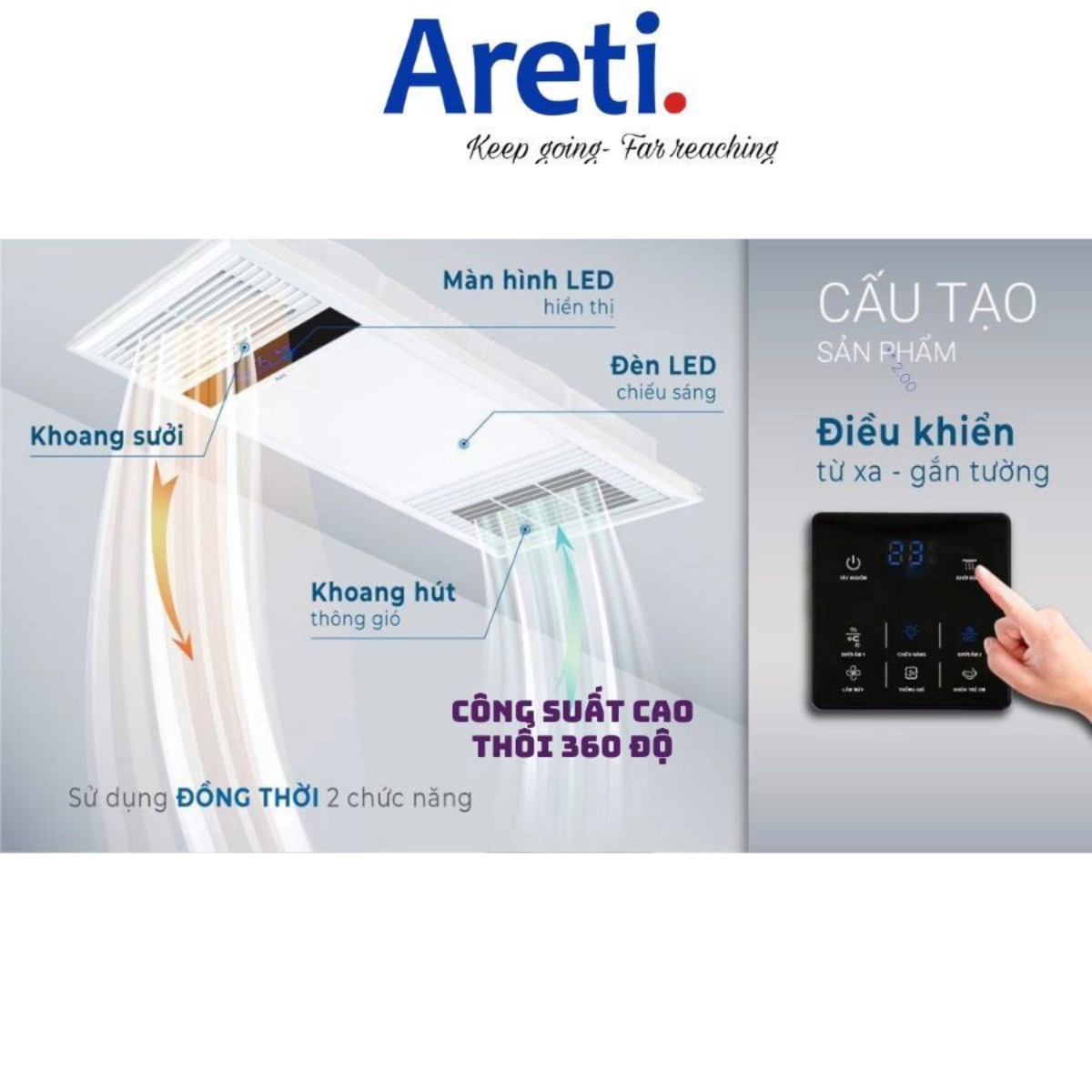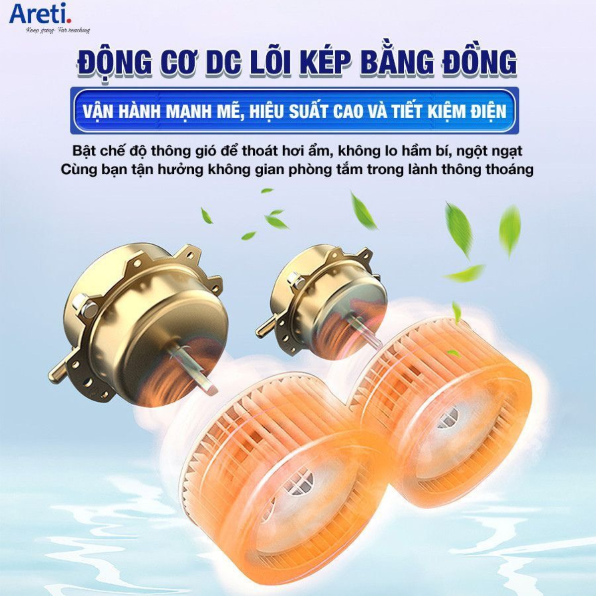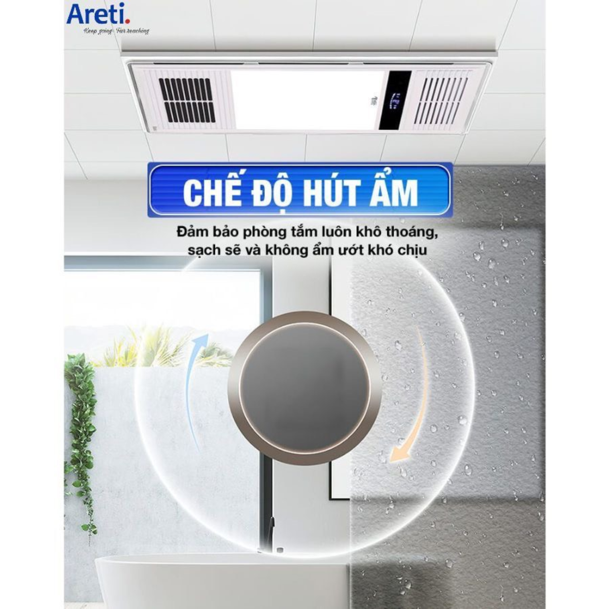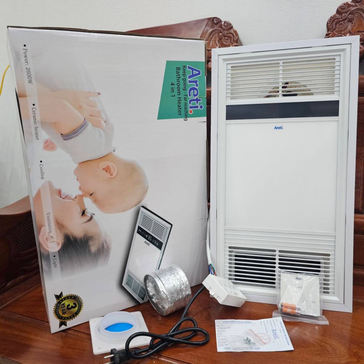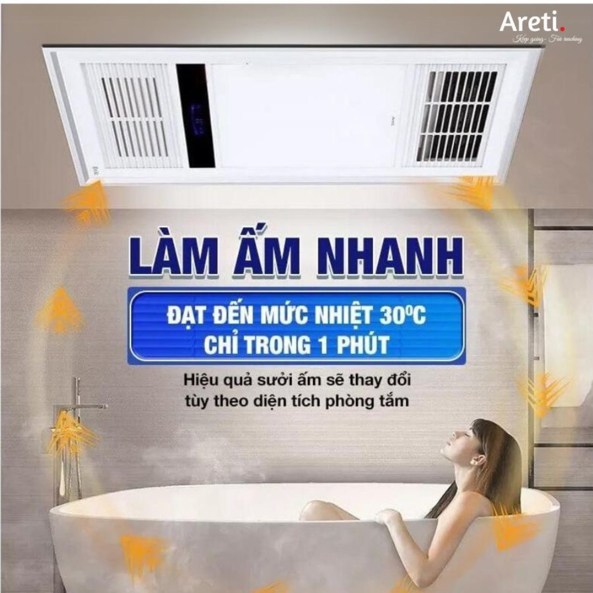 Quạt sưởi đèn sưởi nhà tắm âm trần Areti 4in1 là giải pháp toàn diện và hiện đại nhất cho không gian phòng tắm của gia đình. Thiết bị tích hợp 4 chức năng ưu việt trong cùng một sản phẩm: Sưởi ấm nhanh chóng, Đèn LED chiếu sáng tràn viền, Quạt thông gió hút mùi và Quạt làm mát không khí. Với thiết kế lắp đặt âm trần sang trọng, an toàn chống nước chuẩn IPX4, cùng hệ thống điều khiển thông minh, Areti 4in1 không chỉ bảo vệ sức khỏe cho cả gia đình trong những ngày đông giá rét mà còn giữ cho phòng tắm luôn khô ráo, thoáng đãng suốt 4 mùa trong năm.