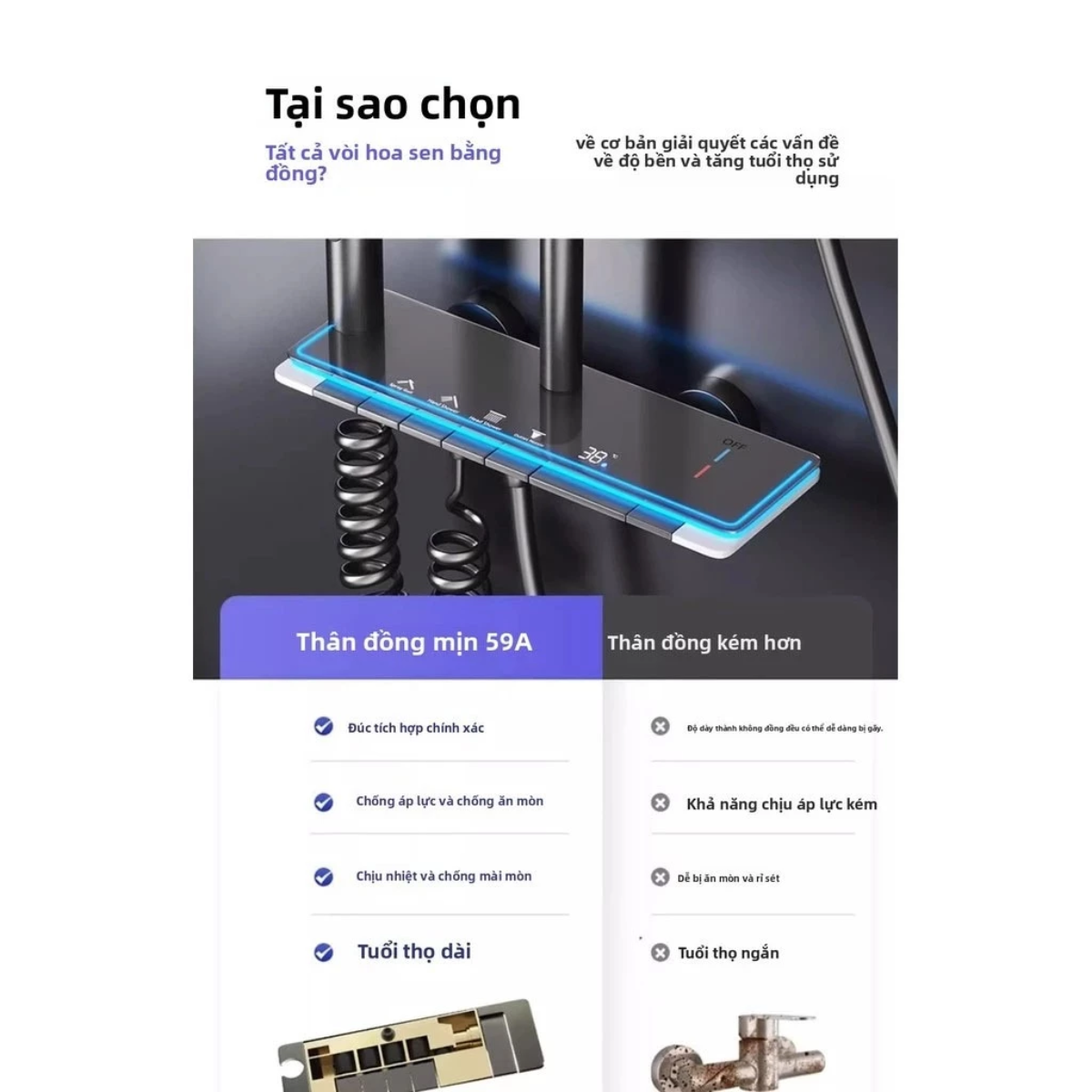 • Thân sen: Cấu tạo từ Inox 304 chịu nhiệt tốt, chống han gỉ và oxy hóa trong môi trường nước.